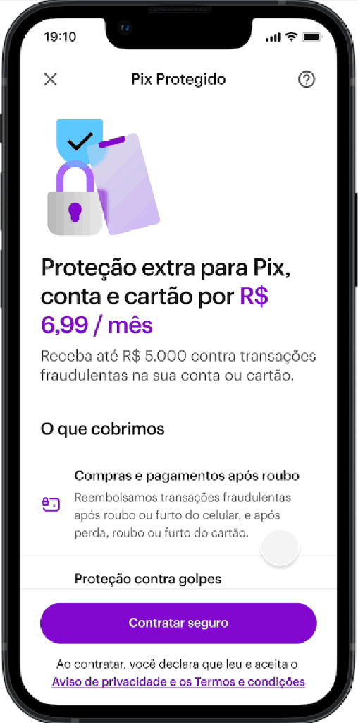 A proteção também cobre compras em lojas falsas e perdas financeiras decorrentes de crimes em que o cliente sofre ameaças. Contratação é simples e rápida, 100% via app do Nu